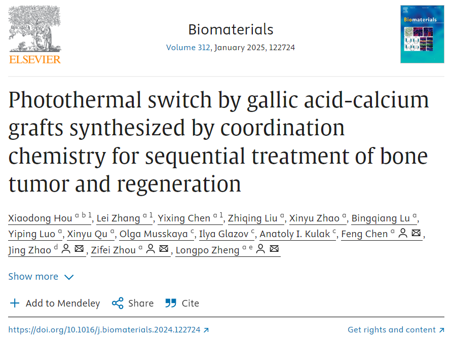 北京时间2024年7月30日,国际学术期刊《生物材料》(Biomaterials)在线发表了伟德国际victor1946附属第十人民医院骨科郑龙坡教授团队的最新研究成果,论文题为“Photothermal Switch by Gallic Acid-Calcium Grafts Synthesized by Coordination Chemistry for Sequential Treatment of Bone Tumor and Regeneration”( 配位化学法合成没食子酸-钙基骨移植物的光热开关序贯治疗骨肿瘤及骨再生)。
