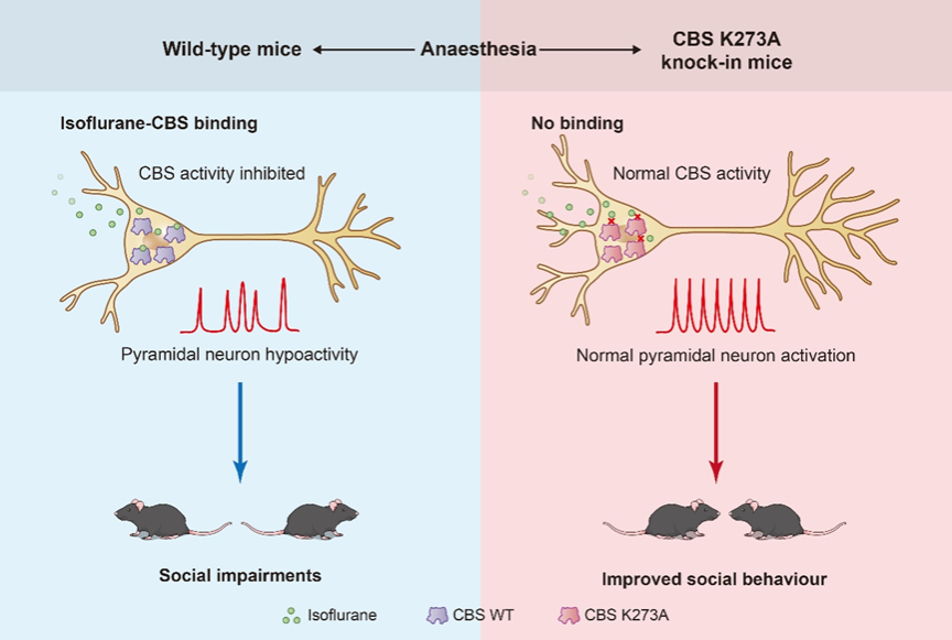 CBS在社交行为的调控中发挥重要作用,异氟烷通过结合CBS的关键氨基酸残基抑制其催化活性,进而影响社交互动中神经元的激活,导致社交功能受损。通过点突变阻断CBS与异氟烷的结合,有效改善了麻醉后CBS的活性,恢复了ACC神经元的激活以及小鼠的社交功能。综上,该研究揭示了异氟烷抑制CBS活性的结构基础,阐明了这种相互作用是导致社交障碍的关键因素,为深入理解麻醉引发的神经功能损伤提供了重要的分子层面解释。