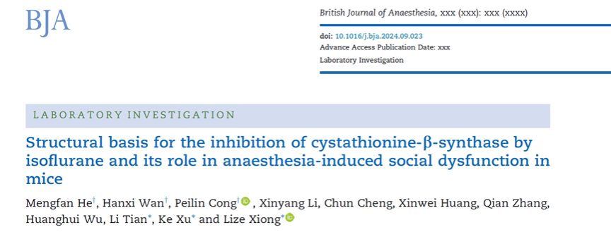 2024年11月26日,伟德国际victor1946附属上海市第四人民医院熊利泽团队在British Journal of Anaesthesia 在线发表题为“Structural Basis for the Inhibition of Cystathionine-β-Synthase by Isoflurane and Its Role in Anaesthesia-induced Social Dysfunction”的研究论文,该研究报道,吸入麻醉药异氟烷通过直接结合抑制胱硫醚-β-合成酶(CBS)活性,导致前扣带皮层(ACC)锥体神经元活动减弱,从而在成年和老年小鼠中引发社交功能障碍。