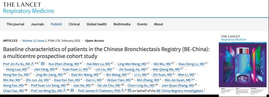 Xu JF, Zheng HZ, Lu HW, et al. Baseline characteristics of patients in the Chinese Bronchiectasis Registry (BE-China): a multicentre prospective cohort study. The Lancet Respiratory Medicine. 2025 ,13(2):166-176