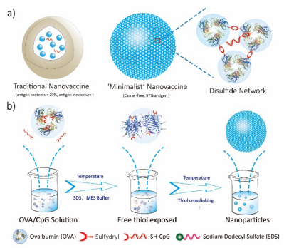 该研究,选取常见的卵清蛋白(OVA)模型抗原利用蛋白质特有的化学结构特点,创新性发展一种“调控巯基暴露+二硫键交联”新型策略,在不使用任何传统纳米载体情况下,介导>500个 抗原分子在纳米尺度上手牵手形成稳定二硫键空间网络结构,构筑得到一种成分 “最简化”的新型纳米疫苗(近于100%抗原组成)。整个方法快速、绿色、尺寸高度可控其他蛋白具有较好普适性