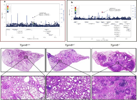 为探索新的结核病易感基因,同济大学附属上海市肺科医院戈宝学教授团队等,通过对3个独立汉族人群(包括8,039例样本)进行三阶段GWAS研究,发现rs12437118和rs6114027 两个新的遗传变异与结核病显著相关,这些易感变异分别位于基因TGM6和ESRRB上。此外,携带有rs6114027位点C等位基因的结核病患者伴有TGM6基因表达水平下降,同时血浆中sIL-2R水平上升,IL-6水平下降,痰涂片带菌量增加,提示该SNP位点是结核病新的易感基因位点。最后,通过CRISPR/Cas9基因编辑技术构建tgm6基因敲除小鼠,利用结核菌动物感染模型,最终证实tgm6在结核病的发病过程中发挥重要作用。本研究为结核病药物靶点研发、疾病预防与诊疗提供新的契机,为实现结核病的精准诊疗奠定基础。
