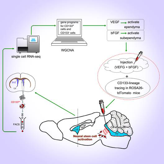 由于成体神经干细胞数量稀少,所处环境复杂,使得在体识别、解析成体神经干细胞的分子特征及示踪成体干细胞的分化谱系面临巨大的挑战。该项研究采用单细胞转录组分析技术和权重基因共表达网络分析技术(WGCNA)研究成年小鼠前脑神经发生区的神经干细胞,揭示了室管膜区静息态神经干细胞、激活态神经干细胞及不同分化阶段神经细胞的表达谱特征,解析了神经干细胞激活的信号途径,发现VEGF信号通路参与了静息态神经干细胞的激活,这些研究成果为阐明哺乳动物成体神经发生的机制奠定了基础。