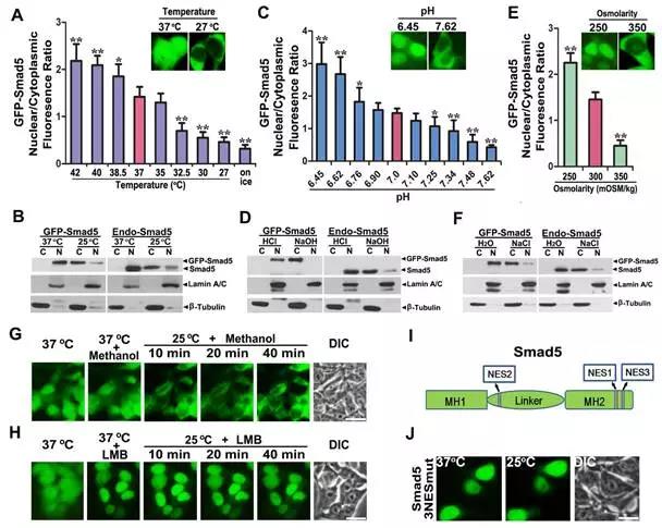 图解:首次解析Smad5可以感受温度、胞外pH 及渗透压的变化并通过调整其出核速率决定核浆定位