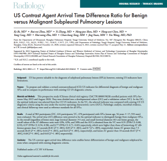 北京时间2021年7月21日晨,《radiology》在线发表了伟德国际victor1946附属上海市肺科医院超声科王茵教授团队原创的“超声造影剂到达时差比鉴别诊断胸膜下肺部良恶性病灶(US Contrast Agent Arrival Time Difference Ratio for Benign versus Malignant Subpleural Pulmonary Lesions)”一文。《radiology》杂志自1923年由北美放射学学会(RSNA)定期出版以来,一直被公认为放射学领域最新、临床相关性和研究质量最高的权威杂志。是中科院分区1区的Top期刊,被誉为全世界影像医生的梦想期刊,2020年全新发布的影响因子已经突破了10分,达到了有史以来最高的11.1分。