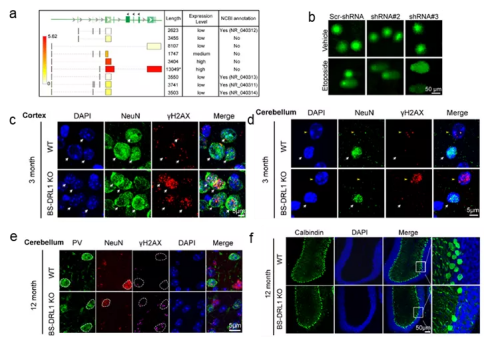 体内体外实验表明,BS-DRL1的缺失会使原代培养的神经细胞,小鼠大脑皮层及小脑中浦肯野细胞在损伤诱导下积累更多的损伤DNA(附图b-d)。且未修复的DNA损伤在生理条件下也会随着小鼠的年龄的增加而积累(附图e),进而造成特定神经细胞随着衰老渐进性死亡(附图f)。