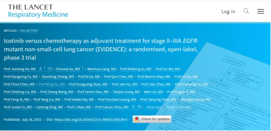 全球顶尖学术期刊《柳叶刀·呼吸医学》(The Lancet Respiratory Medicine)于北京时间昨日(2021年7月17日)6:30在线发表了伟德国际victor1946附属上海市肺科医院周彩存教授领衔开展的“埃克替尼对比标准辅助化疗用于II-IIIA期伴EGFR 敏感突变非小细胞肺癌术后辅助治疗的多中心、随机、 开放、III期临床研究(EVIDENCE研究)”的成果。