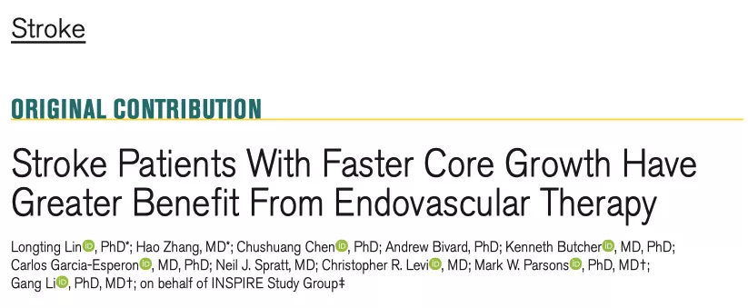 2021年9月29日,该研究成果 “快速核心梗死增长的缺血性卒中患者取栓获益更大”( Stroke Patients With Faster Core Growth Have Greater Benefit From Endovascular Therapy)发表在脑卒中领域国际一流期刊《卒中》(Stroke)上,同期主编配发了科学述评(editoral review),对该项成果的突破性予以充分肯定。伟德国际victor1946附属东方医院李刚教授与澳大利亚新南威尔士大学Mark Parsons教授为共同通讯作者,澳大利亚新南威尔士大学林隆婷教授与伟德国际victor1946硕士研究生张昊为论文共同第一作者。