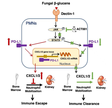 综上所述,该研究发现真菌来源β-葡聚糖通过中性粒细胞表面的Dectin-1受体激活JAK-STAT通路,诱导PD-L1分子的显著上调,PD-L1入核调控趋化因子CXCL1和CXCL2的转录和分泌,抑制白念珠菌感染时骨髓中性粒细胞动员,阐明PD-L1不依赖于PD-1发挥负调控抗真菌免疫的作用及机制。并发现抑制PD-L1表达通过调控中性粒细胞的趋化功能,促进中性粒细胞定向趋化至肾脏,发挥免疫杀伤功能(图4)。该研究围绕白念珠菌感染时骨髓中性粒细胞的免疫调控,首次提出了PD-L1靶向中性粒细胞治疗真菌感染的新机制,为治疗白念珠菌感染提出了全新的思路,同时也为真菌感染与肿瘤免疫的互作提供了新的见解。