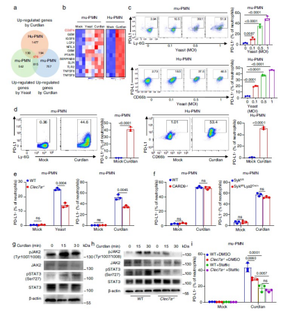 该研究利用RNA测序分析发现小鼠骨髓中性粒细胞和人外周血中性粒细胞在β-葡聚糖刺激后PD-L1表达显著升高(图1a-d);Dectin-1受体编码基因缺失(Clec7a-/-)后,而非CARD9和Syk,显著降低真菌β-葡聚糖刺激小鼠中性粒细胞表达PD-L1的比率(图1e,f)。KEGG分析显示β-葡聚糖激活中性粒细胞JAK-STAT信号通路,免疫印迹结果证明β-葡聚糖刺激显著增加小鼠中性粒细胞JAK2和STAT3的磷酸化水平,而Dectin-1受体缺失后可以显著降低β-葡聚糖刺激的小鼠中性粒细胞JAK2、STAT3磷酸化水平(图1g,h)。利用JAK2-STAT3通路抑制剂Stattic处理,能够显著降低β-葡聚糖诱导中性粒细胞中表达PD-L1的比率(图1i)。结果表明β-葡聚糖激活Dectin-1可介导JAK2和STAT3的磷酸化,从而调节中性粒细胞PD-L1的表达。