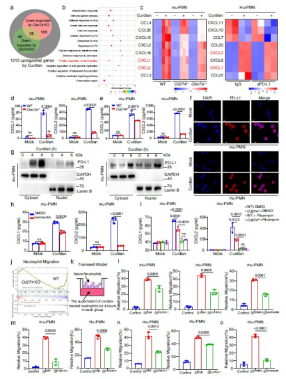进一步研究PD-L1调控中性粒细胞的生物学功能,发现Dectin-1和PD-L1基因缺失后小鼠骨髓中性粒细胞的细胞运动被显著抑制,β-葡聚糖诱导中性粒细胞分泌CXCL1和CXCL2的水平显著降低,同时,PD-L1抗体阻断后人血中性粒细胞β-葡聚糖诱导分泌的CXCL1和CXCL2水平也显著降低(图2a-e)。接下来作者探讨了真菌β-葡聚糖激活中性粒细胞PD-L1调控CXCL1和CXCL2分泌的分子机制,发现PD-L1入核与sp1结合调控CXCL1和CXCL2的转录和分泌,从而影响中性粒细胞的运动(图2f-o)。