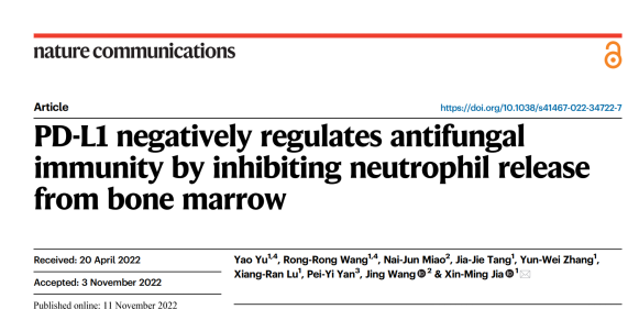 2022年11月11日,伟德国际victor1946伟德国际victor1946、伟德国际victor1946附属第十人民医院贾鑫明教授团队在Nature Communications在线发表了题为“PD-L1 negatively regulates antifungal immunity by inhibiting neutrophil release from bone marrow”的论文。该研究揭示了PD-L1负调控抗真菌免疫的新机制,发现真菌β-葡聚糖通过Dectin-1受体激活中性粒细胞PD-L1的表达,PD-L1入核调控趋化因子CXCL1和CXCL2的转录和分泌,抑制骨髓中性粒细胞向感染脏器的迁移,发挥负调控抗真菌免疫的作用,并发现含笑内酯提取衍生物ACT001在体内能够有效抑制PD-L1的表达,从而显著提高小鼠感染真菌的生存率;该研究结论为靶向PD-L1研发真菌感染治疗的新策略提供了理论依据。
