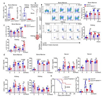 为了进一步明确在系统性念珠菌感染时中性粒细胞PD-L1的免疫调控作用,研究者构建了PD-L1中性粒细胞条件性敲除小鼠(图3a),研究发现白念珠菌感染后,敲除小鼠骨髓中性粒细胞数量显著减少,同时肾脏内中性粒细胞数量显著增加,骨髓中CXCL1/2的水平显著下降,感染小鼠肾脏荷菌量显著减少、存活率显著增加(图3b-e),进一步提示白念珠菌感染诱导中性粒细胞高表达PD-L1能够调控中性粒细胞从骨髓向外周迁移。