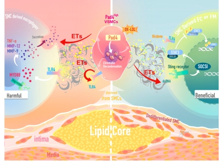 图2:血管平滑肌细胞来源的巨噬细胞产生细胞外捕捉可通过影响血管平滑肌细胞转分化方向促进斑块进展和加重斑块不稳定
