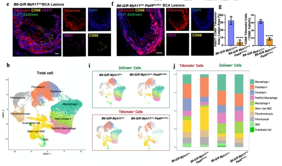 为了进一步明确血管平滑肌细胞来源巨噬细胞外捕捉对斑块进展的影响,研究者构建了三基因敲除小鼠(Myh11Cre/B6G/Pad4flox/flox)并制成动脉粥样硬化模型,通过流式分选Tdtomato+的血管平滑肌细胞结合单细胞测序技术,首次探讨了体内抑制血管平滑肌细胞产生细胞外捕捉通过改变血管平滑肌细胞命运重编程方向,从而影响动脉粥样硬化不稳定性和斑块进展。进一步提示了血管平滑肌细胞来源巨噬细胞产生细胞外捕捉对于改变斑块内微环境具有重要作用(图2)
