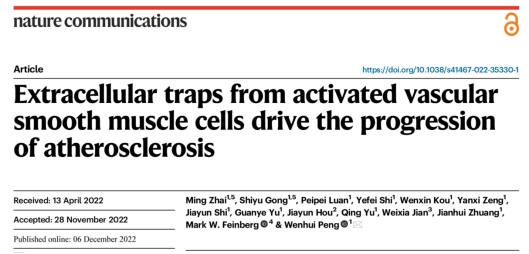2022年12月6日,伟德国际victor1946附属第十人民医院彭文辉教授团队在Nature Communications在线发表了题为“Extracellular traps from activated vascular smooth muscle cells drive the progression of atherosclerosis”的研究论文。该研究首次揭示了在动脉粥样硬化斑块进展过程中,血管平滑肌细胞发生巨噬细胞转分化伴随PAD4表达升高,发生细胞外捕捉这一生物学现象。细胞外捕捉释放的DNA等物质,通过激活斑块中其他细胞的TLR4信号通路和STING-SOCS1信号通路,加速血管平滑肌细胞向致病性转分化,促进斑块进展和不稳定。该研究结论为动脉粥样硬化中血管平滑肌细胞命运重编程后相关功能研究填补了空白,为精准化靶向干预血管平滑肌细胞转分化方向从而治疗动脉粥样硬化疾病提供了理论依据。伟德国际victor1946附属第十人民医院彭文辉教授为该论文的唯一通讯作者,伟德国际victor1946翟鸣、贡时雨博士研究生为论文的共同第一作者。