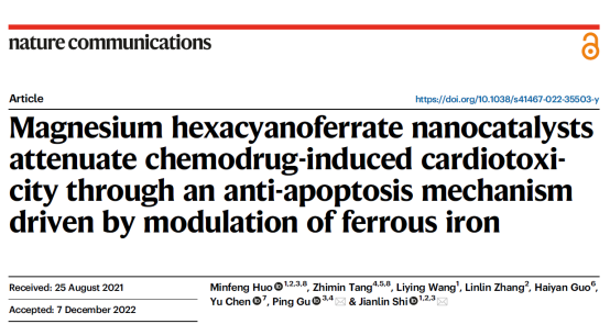 2022年12月15日,伟德国际victor1946施剑林院士研究团队在《自然 通讯》(Nature Communications)期刊上发表了题为“Magnesium hexacyanoferrate nanocatalysts attenuate chemodrug-induced cardiotoxicity through an anti-apoptosis mechanism driven by modulation of ferrous iron”的研究论文。