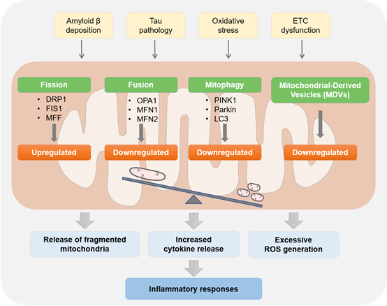 线粒体质量控制是一个总称,包括线粒体分裂和融合、线粒体运输和线粒体自噬。在AD小鼠模型中,由于线粒体动力学失调,活化的小胶质细胞中线粒体受损。这些受损的线粒体被释放到细胞外,通过靶向附近的星形胶质细胞来诱导先天免疫应答,进而释放出更多功能失调的线粒体,产生正反馈,加速神经炎症。在AD患者脑组织、AD转基因小鼠及细胞模型中,研究人员观察到线粒体功能障碍和线粒体自噬缺陷,并介导Aβ和pTau病理,诱发脑内炎症反应。挽救线粒体过度分裂和线粒体自噬异常可改善相关病理,提示线粒体质量控制异常可能成为AD的治疗靶点。