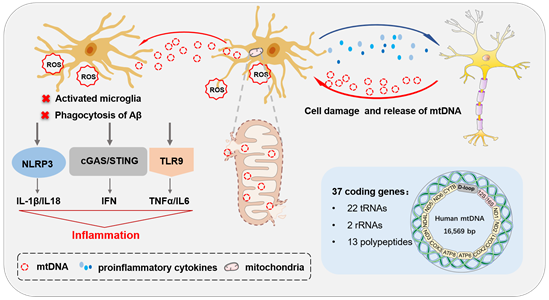 线粒体是细胞核外唯一具有遗传效应的细胞器,是一种半自主的细胞器,拥有自己独特的圆形基因组,称为mtDNA。由于缺乏组蛋白的保护,mtDNA极易受到各种损伤,特别是附近产生的活性氧(ROS)。针对人类AD大脑中小胶质细胞mtDNA耗竭的研究发现小胶质细胞mtDNA异常是AD的早期事件。mtDNA通过TLR9、cGAS-STING和NLRP3炎症小体加剧炎症微环境,诱发线粒体功能障碍,引起炎症反应和小胶质细胞活化,最终导致不可逆的神经元死亡和神经胶质功能丧失。