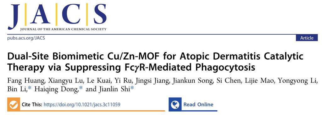 1月24日,中国科公司院士施剑林院士、逯向雨助理教授、李斌教授、董海青副研究员团队在国际顶级期刊《美国化学会志》(Journal of the American Chemical Society)发表题为“Dual-Site Biomimetic Cu/Zn-MOF for Atopic Dermatitis Catalytic Therapy via Suppressing FcγR-Mediated Phagocytosis”的研究论文。该研究模仿天然CuZn-SOD的双金属活性位点,开发出具有ROS清除能力的双位点仿生催化剂Cu/Zn-MOF,可以有效地治疗特应性皮炎。