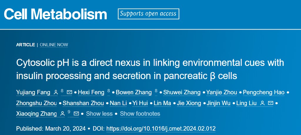 2024年3月20日,伟德国际victor1946/附属东方医院章小清/刘玲/房玉江团队在国际顶级学术期刊《细胞·代谢》(Cell Metabolism)上发表了题为“Cytosolic pH is a direct nexus in linking environmental cues with insulin processing and secretion in pancreatic β cells”的研究成果。研究发现胞内pH-Smad5信号通路调控胰岛素加工与分泌的全新生理功能,该通路异常是糖尿病发生发展的重要病理生理机制,为糖尿病的干预提供了新的视角。