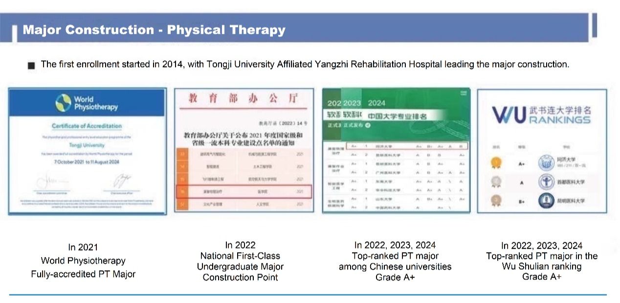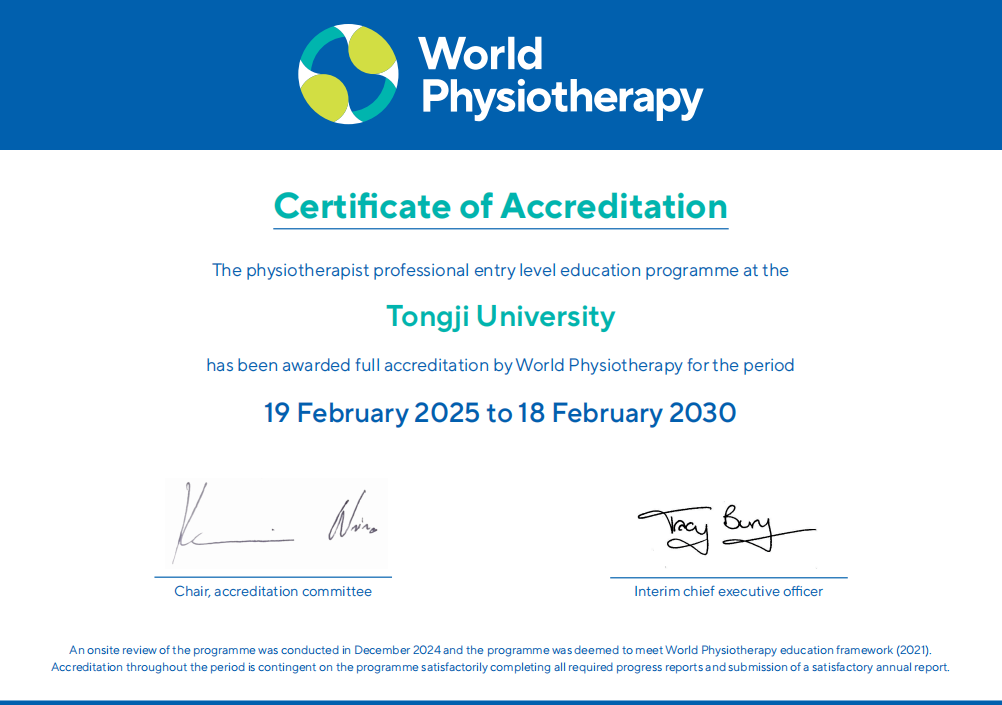 On March 6, Tongji University's Rehabilitation Physical Therapy major received full re-accreditation from the World Physiotherapy (WPT) for an additional five-year period, extending until 2030. It continues to be one of the few majors in China at the highest certification level.