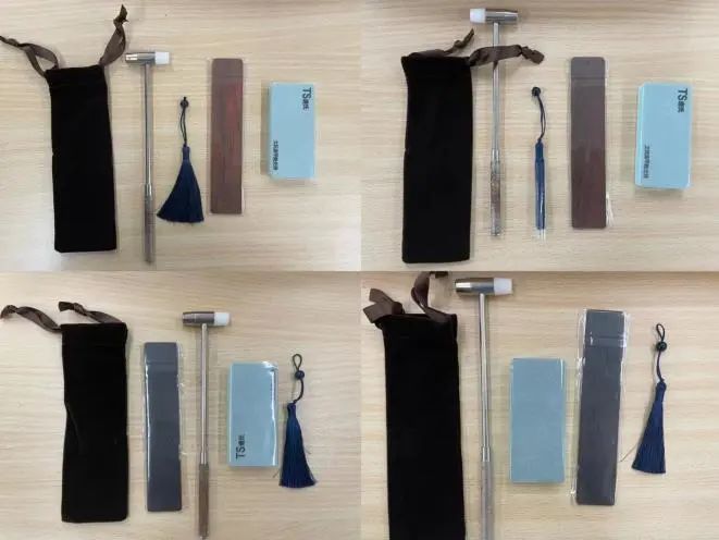 在听完老师科普后,教师们跃跃欲试。每位老师领取了银丝镶嵌的工具,包括木材、0.5~0.8mm粗细的银丝、锤子、抛光棉、流苏等。首先老师们选择了带有不同图案的木材,接着进行镶嵌。这一步首先要将银丝退火(软化银丝),银丝一端先压入线槽内,用锤子敲击压平整,转弯的地方可以借助水笔笔尖进行弯曲塑形。镶嵌完毕后因为银丝表面会有不平整的地方,需要用抛光棉进行打磨,抛光。最后装上流苏,银丝镶嵌作品就这样完成了。