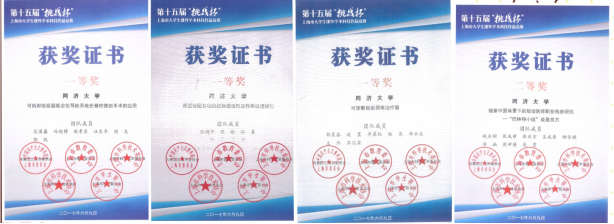 决赛中,我院各项目组成员经过充分的准备和精彩的答辩,取得了优异成绩共斩获一等奖三项、二等奖一项。其中范国鑫组的《可拆卸组装圆弧定位导航系统在脊柱微创手术的应用》项目、张晓申组的《新型铋配合物的抗肿瘤活性及作用机理研究》项目、与机械公司合作的《可穿戴智能颈椎治疗器》项目荣获一等奖;赵永昭组的《健康背景下的规培医师职业倦怠研究——“巴特林小组”或是良方》项目荣获二等奖。