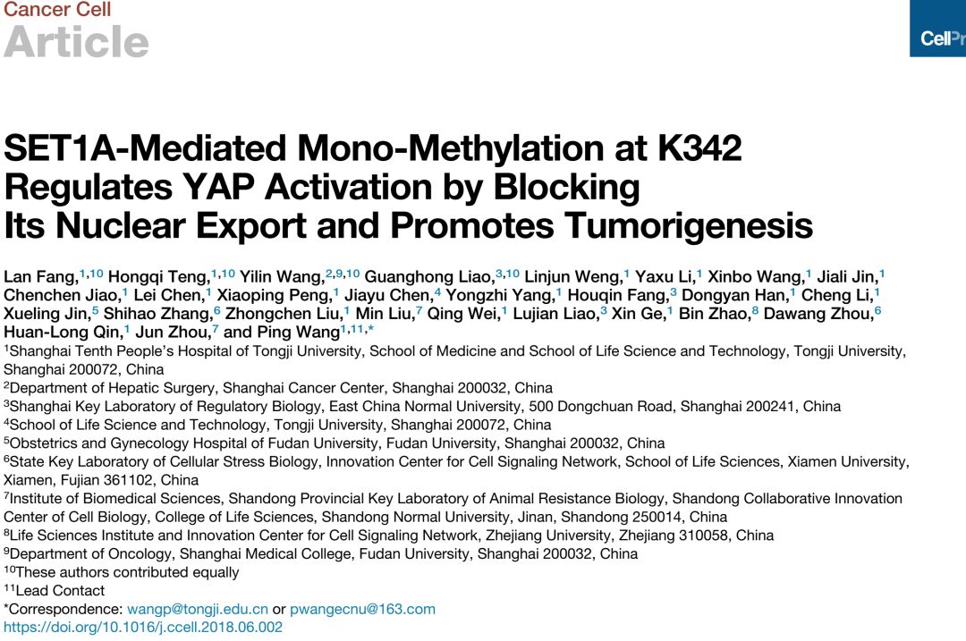 伟德国际victor1946王平教授长期研究肿瘤微环境对关键信号通路蛋白翻译后修饰的调节分子机制,对TOR、NFkB等通路的调节机制提出了新见解。6月29日最新一期Cancer Cell杂志在线发表了王平教授团队题为SET1A-mediated mono-methylation at K342 regulates YAP activation by blocking its nuclear export and promotes tumorigenesis的研究论文,从蛋白质翻译后修饰的角度阐明了Hippo通路调控的新机制及其在肿瘤发生发展中的作用。