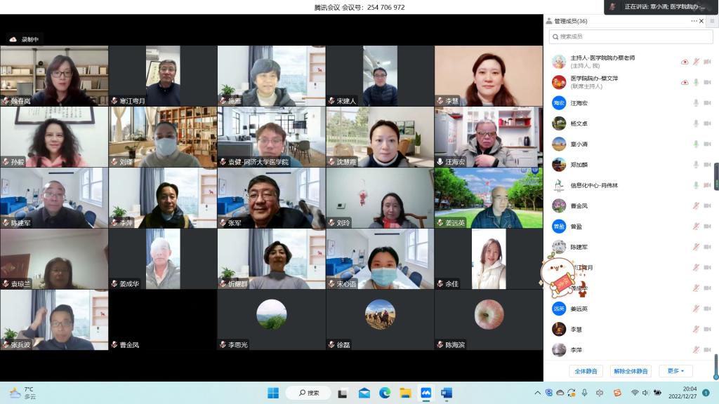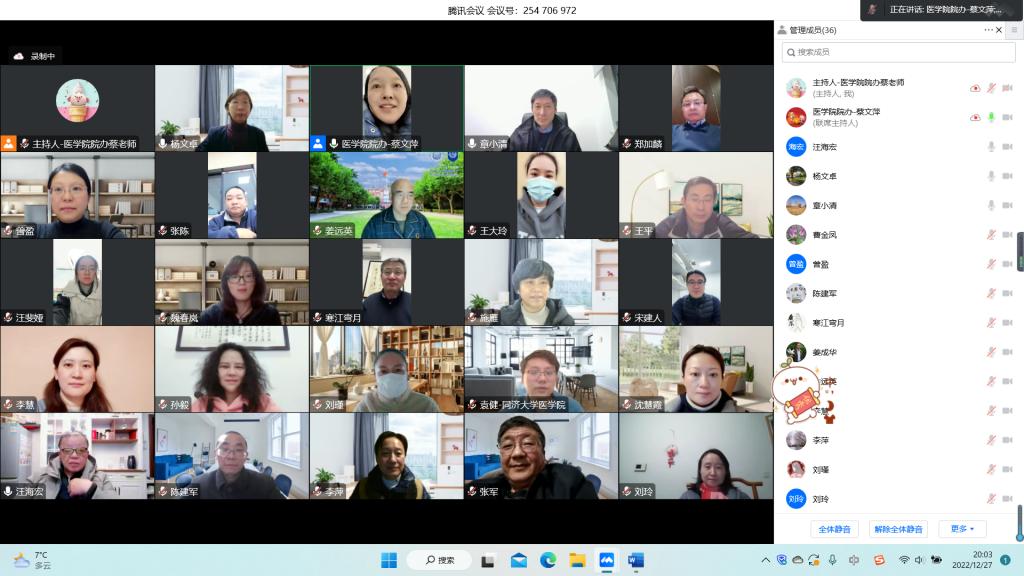 为深入学习贯彻落实二十大会议精神,在双一流高校建设的整体规划下,践行“同济天下,崇尚科学,创新引领,追求卓越”的新时代同济文化,推进医学学科高质量建设、探索医学交叉融合发展模式、深化科学精细化创新管理,加强中层干部队伍梯队建设、优化中层干部考核机制体制、落实中层干部岗位职责、完善治理体系建设、提升干部治理能力,伟德国际victor1946于12月27日以腾讯会议室线上形式举办2022年度中层干部工作总结述职报告会议。医学与生命科学党工委、医管处、公司领导班子全体成员参会,中国科公司院士、生物医学工程与纳米科学研究院经理施剑林列席会议。会议由公司党委副书记陈海滨和副经理杨文卓主持。