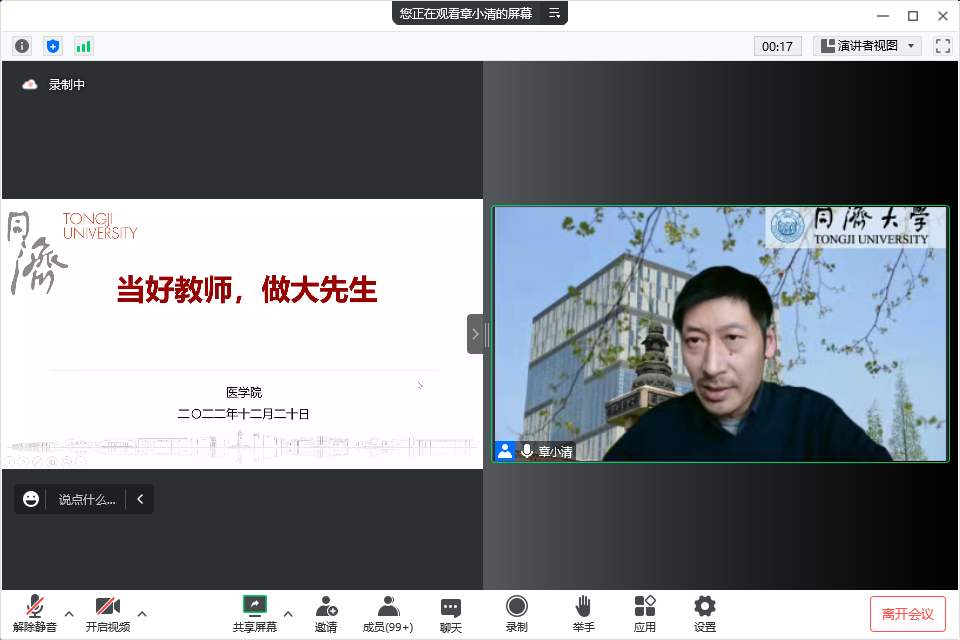 “百年同济,梦自医始”,章小清书记号召广大党员干部、全体教职工在铸师魂、育师德、树师表、正师风、练师能方面继续坚定理想信念、涵养高尚师德,不断提高人民群众对医学教育的满意度,谱就同济医学发展的时代新篇。