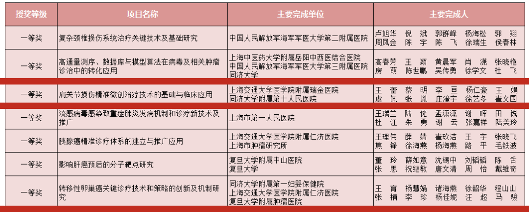 附属第一妇婴保健院王育牵头完成的项目“转移性卵巢癌关键诊疗技术和策略的创新及机制研究”及伟德国际victor1946合作完成的项目“高通量测序、数据库与模型算法在病毒及相关肿瘤诊治中的转化应用”、附属第十人民医院合作完成的项目“肩关节损伤精准微创治疗技术的基础与临床应用”分别荣获2022年度上海医学科技奖一等奖。