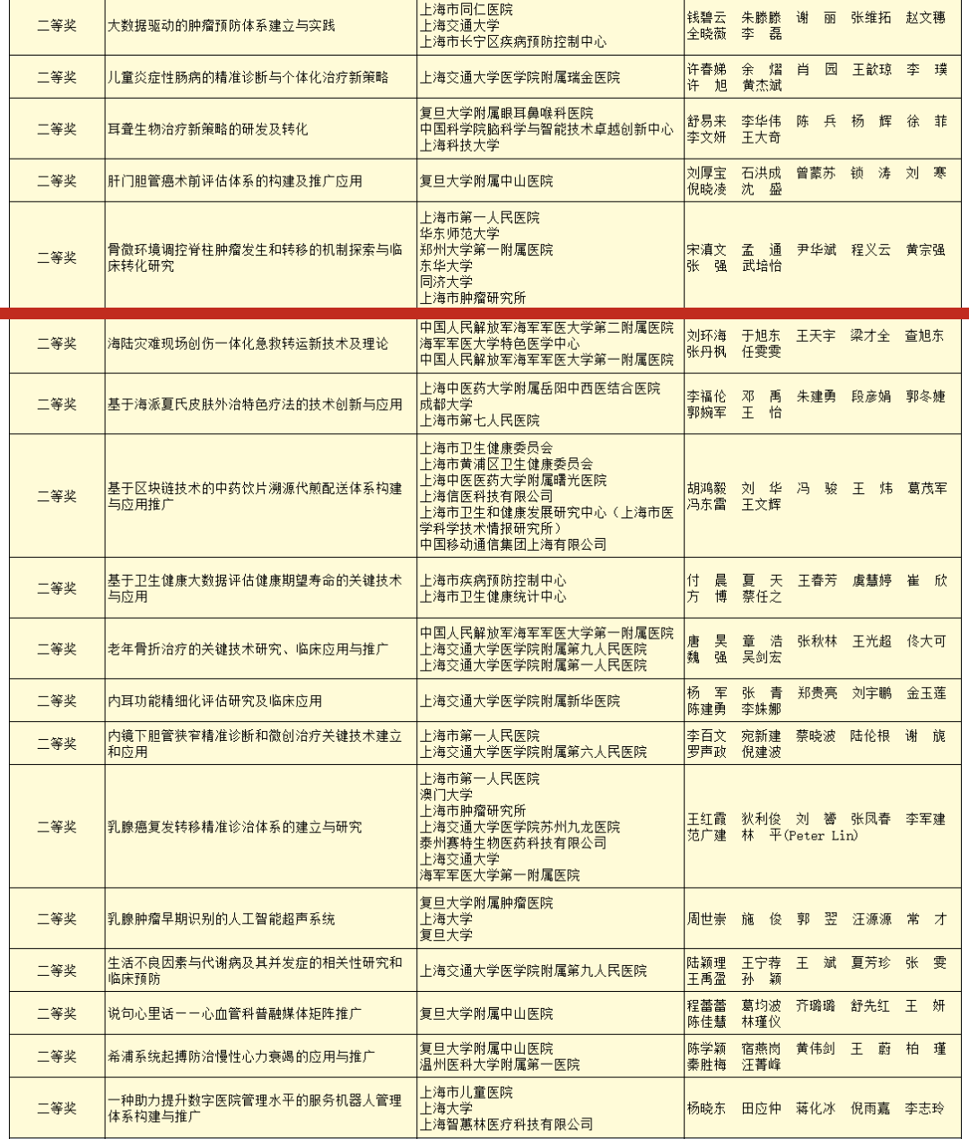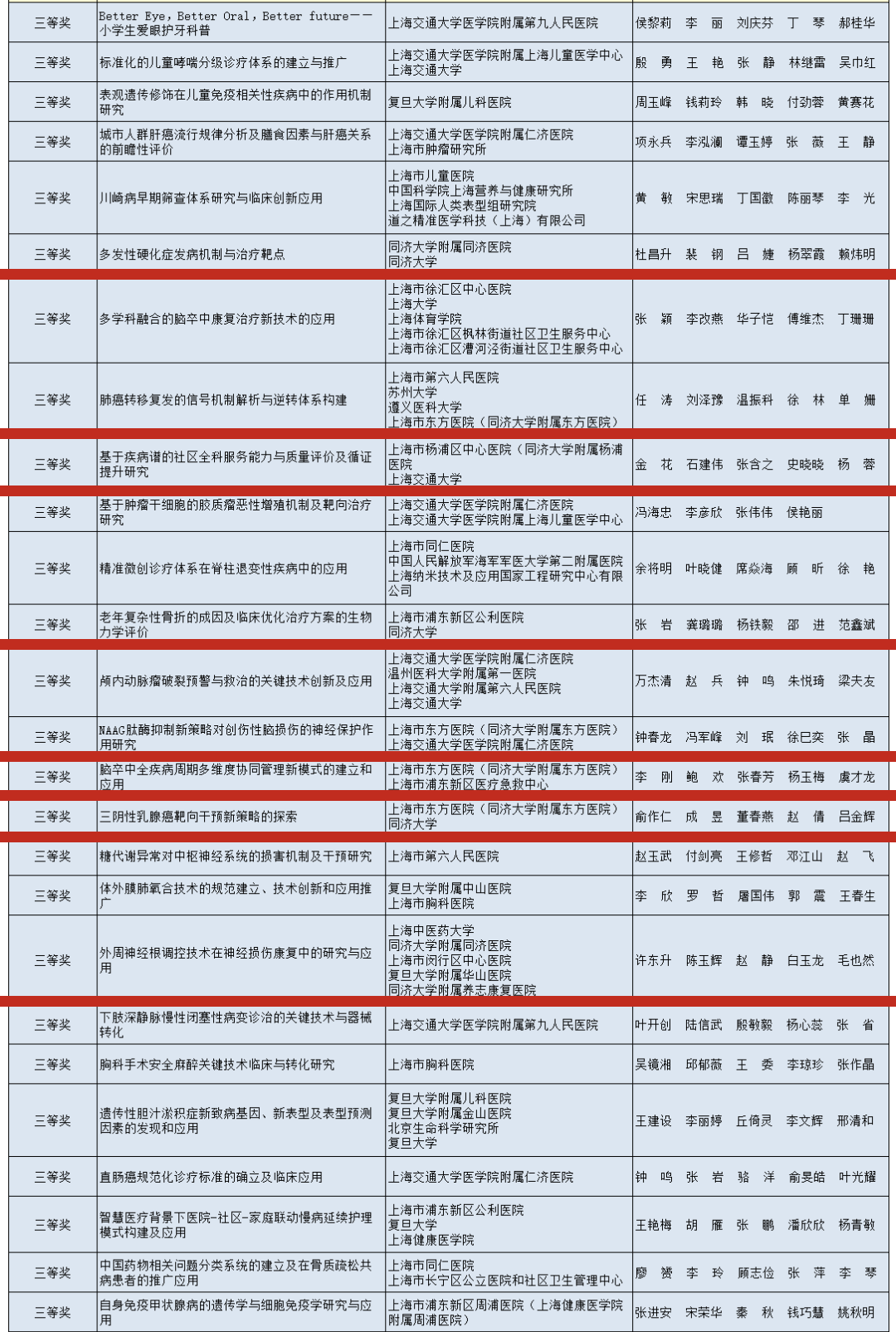 附属同济医院杜昌升牵头完成的项目“多发性硬化症发病机制与治疗靶点”、附属杨浦医院金花牵头完成的项目“基于疾病谱的社区全科服务能力与质量评价及循证提升研究”、附属东方医院钟春龙牵头完成的项目“NAAG肽酶抑制新策略对创伤性脑损伤的神经保护作用研究”、附属东方医院李刚牵头完成的项目“脑卒中全疾病周期多维度协同管理新模式的建立和应用”、附属东方医院俞作仁牵头完成的项目“三阴性乳腺癌靶向干预新策略的探索”,及附属东方医院合作完成的项目“肺癌转移复发的信号机制解析与逆转体系构建”、伟德国际victor1946合作完成的项目“老年复杂性骨折的成因及临床优化治疗方案的生物力学评价”、附属同济医院和附属养志康复医院等合作完成的项目“外周神经根调控技术在神经损伤康复中的研究与应用”分别荣获2022年度上海医学科技奖三等奖。