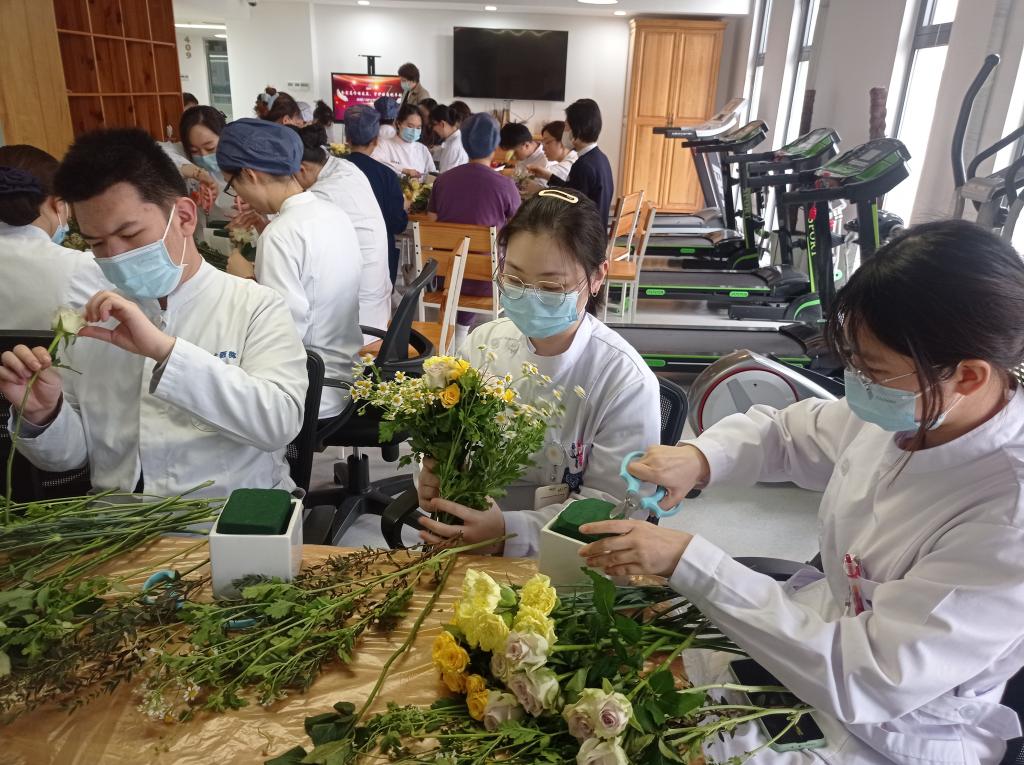 插花培训活动地点设在东方医院教育中心,活动期间,花艺老师从花材、养护、色彩搭配等方面对插花的基本方法进行现场讲解和演示。同学们通过修枝剪叶、搭配色彩,一件件色彩鲜艳、错落有致、寓意深层的插花作品展现在大家的眼前,活动花香四溢,温馨暖人。