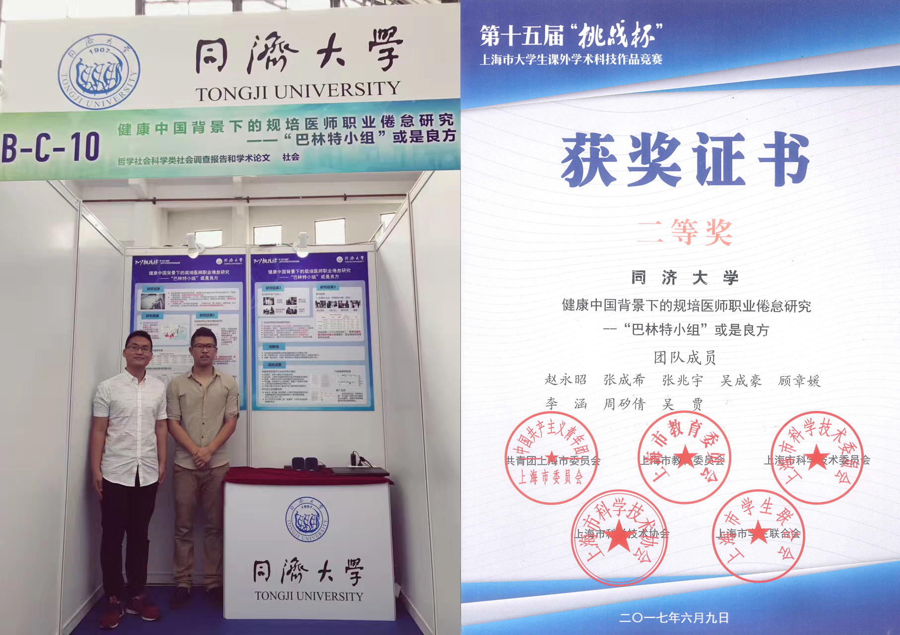 近日,第十五届“挑战杯”上海市老员工课外学术科技作品竞赛落下帷幕。公司2013级赵永昭同学的作品《健康中国背景下的规培医师职业倦怠研究——“巴林特小组”或是良方》荣获上海市二等奖。