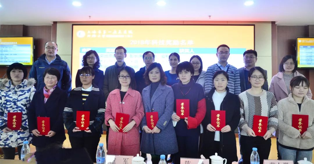 杨浦区卫生计生委副主任薛人翼宣读医院2018年科技奖励名单。