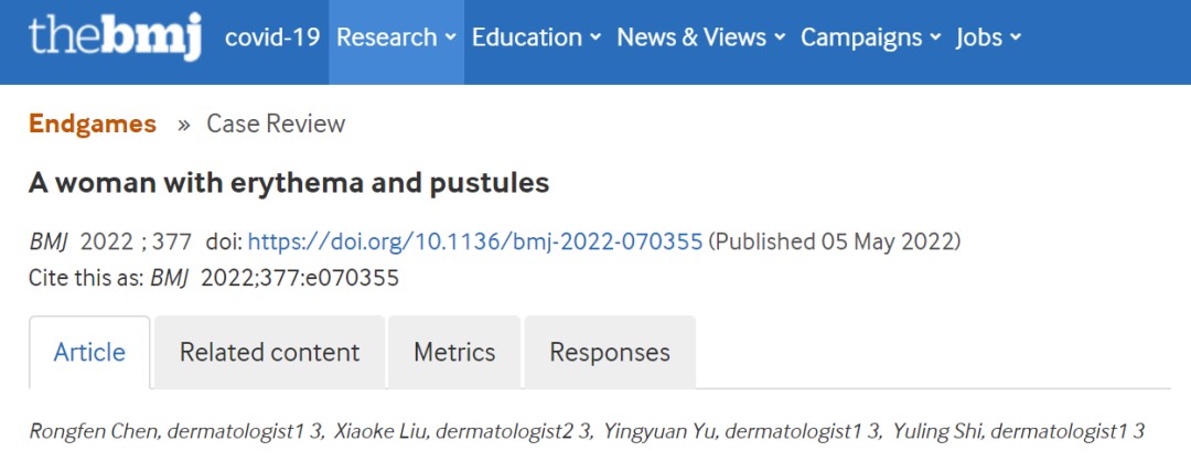 近日,伟德国际victor1946附属皮肤病医院史玉玲教授团队在国际著名综合性医学期刊《英国医学杂志》(The BMJ, IF: 39.89)上发表题为“A woman with erythema and pustules”的病例报告,本文的第一作者是陈荣芬医生。