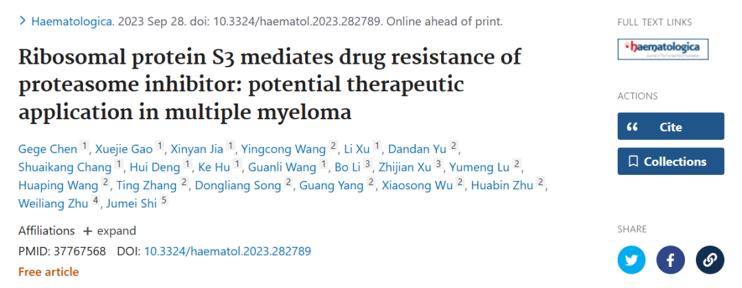 2023年9月,伟德国际victor1946附属东方医院血液内科施菊妹教授团队在《Haematologica》(IF=10.1)在线发布了题为“Ribosomal protein S3 mediates drug resistance of proteasome inhibitor: potential therapeutic application in multiple myeloma”的研究论文。