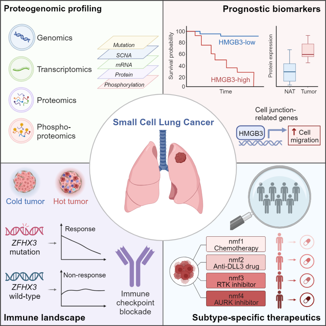 该研究对112例小细胞肺癌患者的肿瘤组织和配对癌旁组织样本进行了蛋白基因组学分析,通过整合基因组、转录组、蛋白质组、磷酸化蛋白质组等多维组学数据,系统揭示了小细胞肺癌的分子特征,为小细胞肺癌的发生发展机制、预后监测、分子分型和个性化治疗策略提供了新思路。