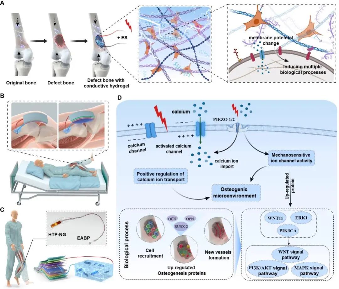 在本研究中,研究者将一种复合压电/摩擦电纳米发电机(HTP-NG)与导电水凝胶组合,构建可体内植入的共生电刺激系统(BD-ES),通过水凝胶优异的可注射性和粘附性,可适用于不同形状的骨缺损。本研究中植入于关节附近的纳米发电机可通过患者主/被动功能锻炼,采集运动过程中产生的能量,产生双相电脉冲电信号以响应康复运动用于促进体内骨再生和干细胞成骨分化,在骨修复方面显示出较好的潜力,契合共生生物电子(symbiotic electronics)与加速康复外科 (Enhanced Recovery After Surgery,ERAS)理念。本研究通过整合康复锻炼和电刺激,为个性化骨修复治疗提供了新的见解。
