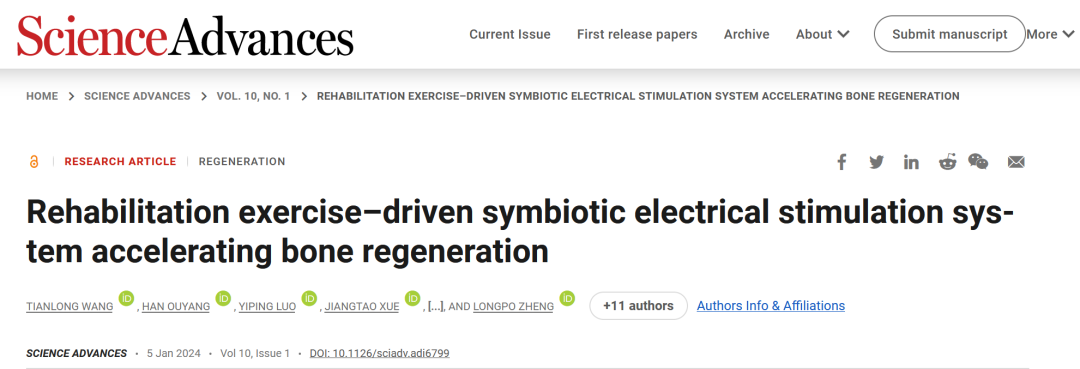北京时间2024年1月5日,学术期刊《科学进展》(Science Advances)在线发表了伟德国际victor1946附属第十人民医院郑龙坡教授团队、中国科公司纳米能源所李舟教授、复旦大学附属口腔医院陈峰研究员/曹文涛副研究员和中国科公司大学欧阳涵副教授团队合作研究成果,创新性的应用微型植入式共生电子器件,利用人体自身康复运动供能、无需电池供电和电路调制就能够提供稳定可控电刺激的共生体系促进骨修复。论文题为 “Rehabilitation Exercise-driven Symbiotic Electrical Stimulation System Accelerating Bone Regeneration”(康复运动驱动的共生电刺激系统加速骨再生)。