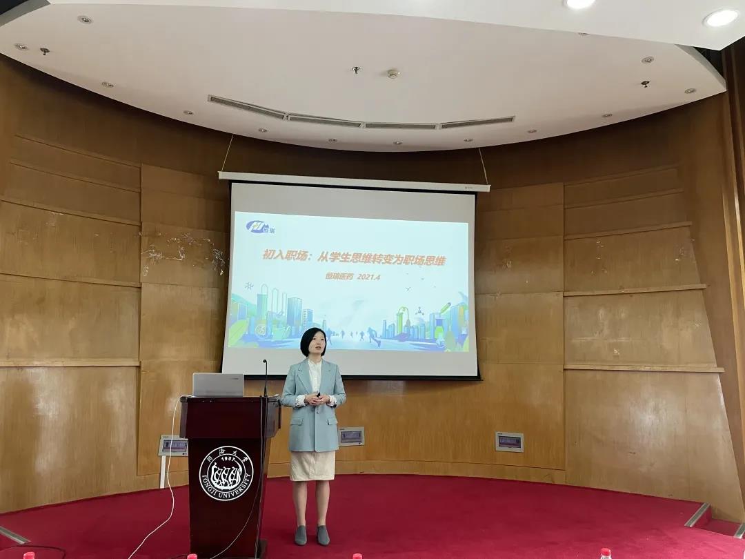 江苏恒瑞医药股份有限公司的王瑛老师给我们带来题为《初入职场:从员工思维转变为职场思维》的分享,为我们剖析了校园与职场生活的不同特点,指出了毕业生进入职场后容易犯的错误,帮助我们快速适应职场,建立正确的工作思路