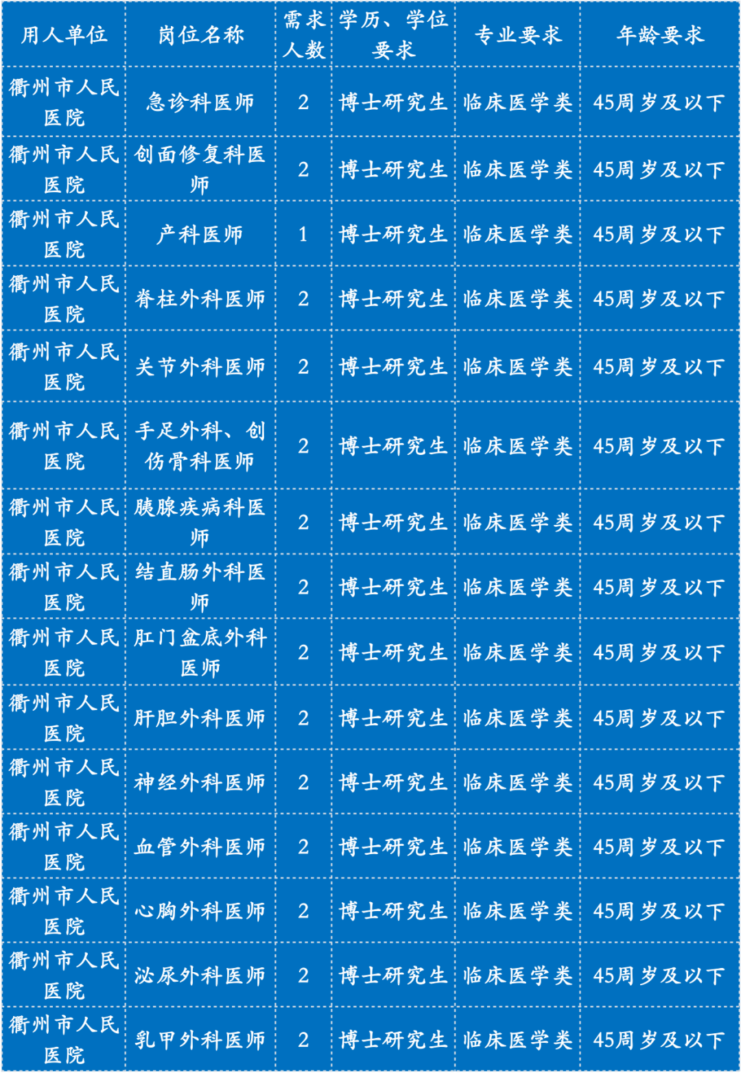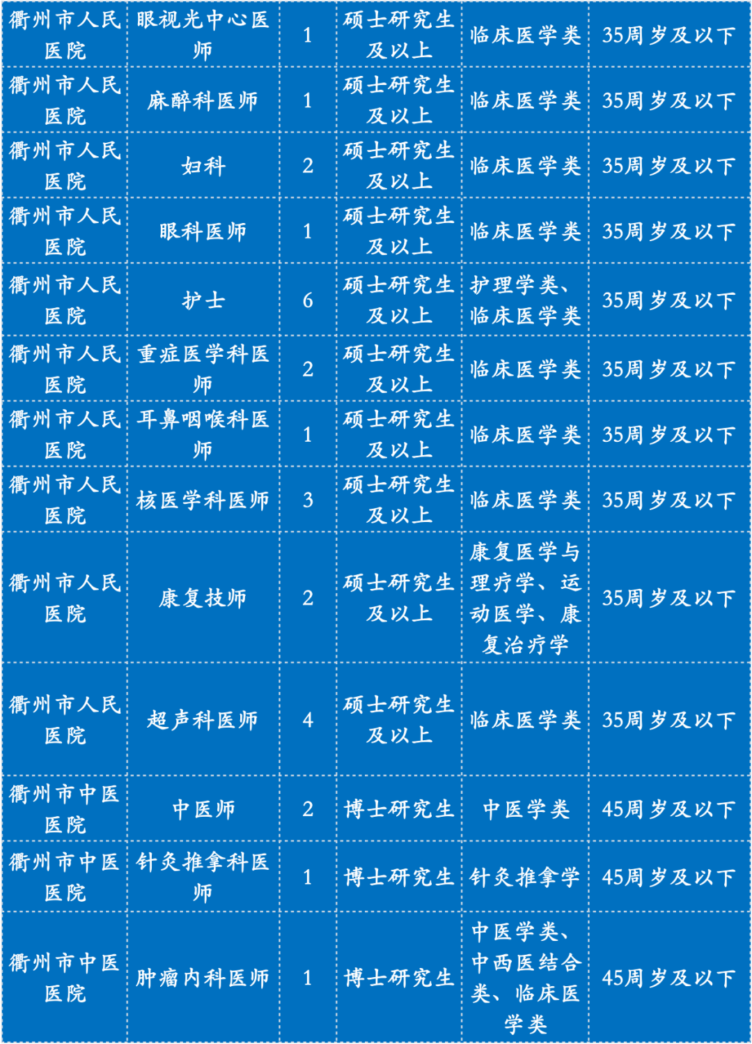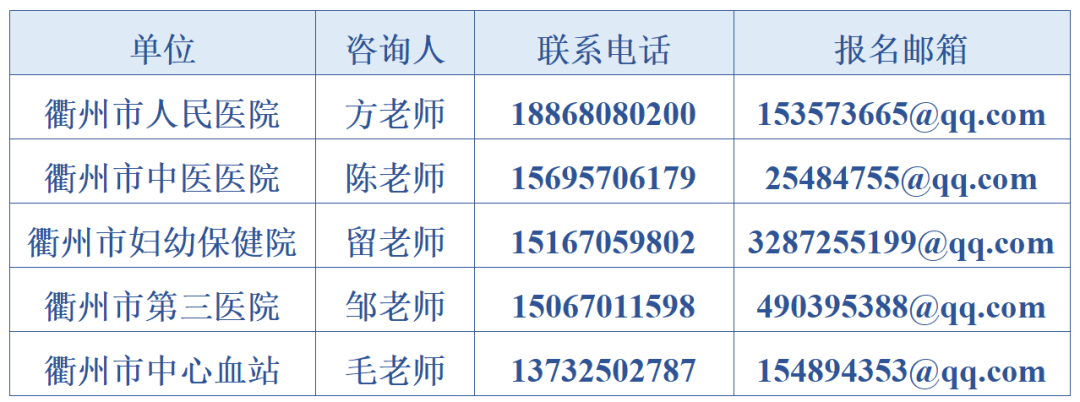 相关要求以2022年11月9日公布在衢州市政府门户网站市卫健委—部门公告公示栏(http://www.qz.gov.cn/col/col1229038943/index.html)的《2023年衢州市卫生健康委员会“引才聚智‘医’起向未来”高层次医疗卫生人才招引公告》(第1期)为准。符合要求的人员可将应聘材料发至各用人单位邮箱。