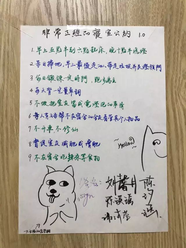 组织员工自主学习“五守”伟德国际victor1946员工行为规范,做“守时”“守序”“守信”“守纪”“守法”的“五守”老员工。为营造良好的寝室环境,培养员工的规矩意识,2017级全体本科新生在每一间寝室制定张贴了个性化的寝室公约,遵守校规校纪从寝室小事做起。