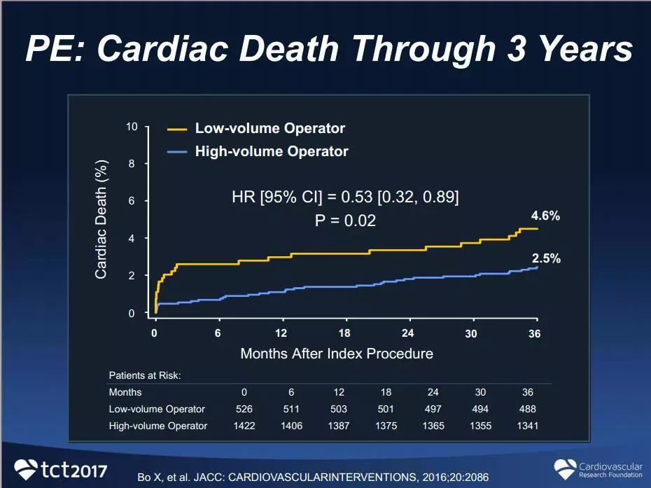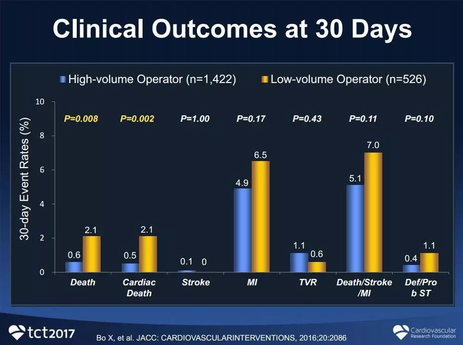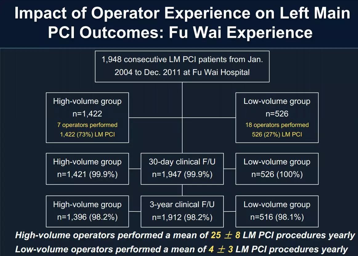 对于高危复杂病变的介入治疗,术者经验和策略制定是决定手术成败和效果的重要因素。中国医学科公司阜外医院徐波教授于2016年发表的左主干术者经验与患者临床预后关系的文章为这一话题提供了很好的循证证据。其回顾性分析了2004~2011年1948例左主干接受介入治疗患者资料,按术者分为有经验术者(连续3年每年完成左主干介入治疗15例及以上)操作组和一般术者操作组。结果发现有经验术者组患者30天、3年的死亡率显著低于一般术者组,多因素分析提示,术者经验是决定患者预后的独立预测因素之一。