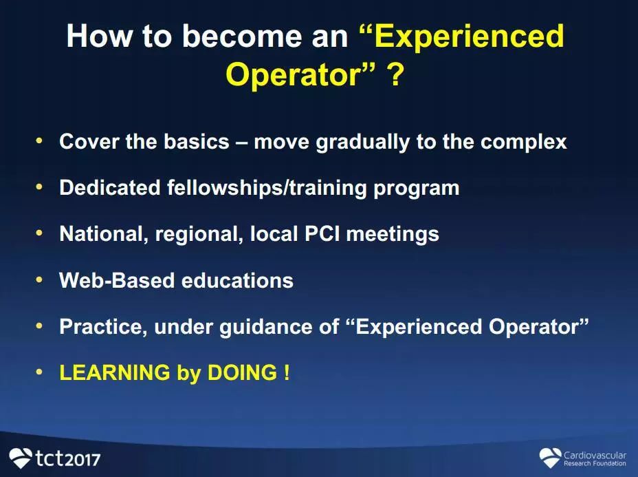 对于高危复杂冠心病患者的介入治疗,应由有经验的医生操作是目前的共识。问题的关键在于,如何让年轻的无经验医生成长为有经验医生,如何平衡患者预后与医生成长之间的矛盾。作为一个有经验冠状动脉介入治疗术者,需要熟练掌握旋磨技术,慢性完全闭塞病变、左主干病变、长病变、扭曲病变、分叉病变的介入治疗方法、策略及相应器械,同时需要掌握左心室辅助装置的应用方法、术中造影剂、放射线的控制,掌握各种并发症的处理方法。要成长为一个有经验的术者,需要掌握心脏介入学的基本知识,接受各种专项培训,如慢性完全闭塞病变治疗、分叉病变治疗等,参与各种会议及学习交流,最为重要的是在有经验医生的指导下增加手术量,从实践中增加经验。在有经验医生指导下进行手术治疗,是平衡经验增长和保障患者预后的重要手段。