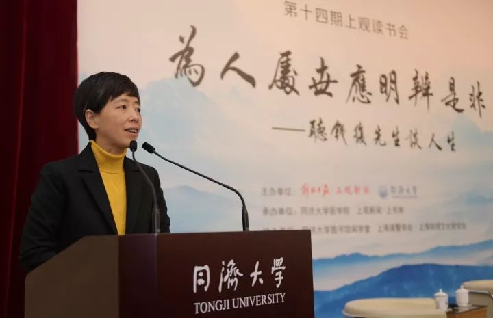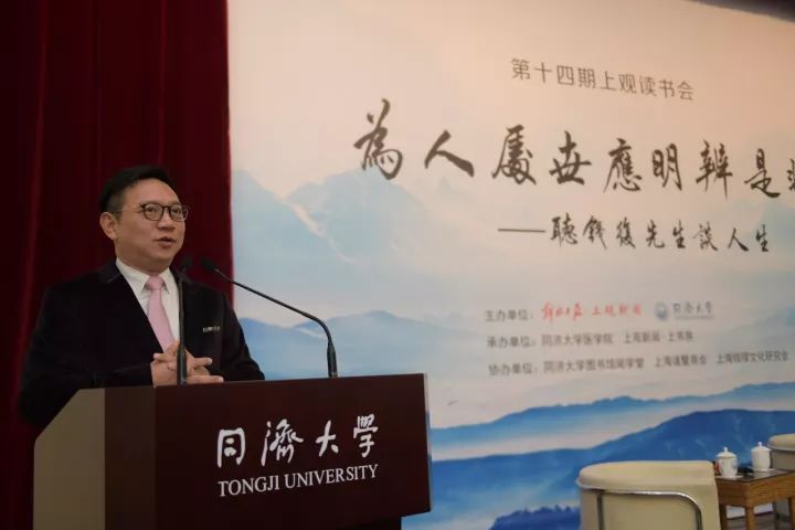 随后伟德国际victor1946党委副书记马锦明致辞,她首先代表同济师生向上观读书会的到来表示热烈欢迎,并特别对钱復先生秉持家训,谨记前辈的教诲,积极促进两岸交流等做出的贡献致以衷心的感谢和崇高的敬意。她谈到今年正好是同济建校110周年,在110周年建校历程当中,形成同舟共济的校训,也是激励全体的同济师生、员工在共同为国家奋斗的事业当中不断做出努力,同时家国情怀也是民族共同的精神追求。这次上观的读书会召开之际,正值十九大刚刚顺利闭幕之际,也是新时代新征程开启之际,十九大当中习近平总书记在报告当中特别强调,文化是一个国家,一个民族的灵魂,文化兴国运兴,文化强民族强,而且讲到要深入挖掘中华优秀传统文化的思想观念,人民精神和道德规范,结合时代的要求继续创新,让中华文化展现出魅力和时代风采。今天的读书会是非常好的文化交流活动,也是非常好的平台,期待未来两岸的同胞秉持“两岸一家亲”的理念,能够不断地增强同根同源的民族文化认同感,来为增强文化自信,促进文化繁荣和实现中华民族伟大复兴的中国梦来同舟共济,逐梦前行。