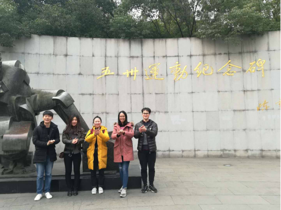 接着我们来到了位于南京西路、西藏中路西南侧的一片绿地中的五卅运动纪念碑。纪念碑的碑体、基座等都是采用泰山一麓的花岗岩,代表着烈士的牺牲重于泰山。来到纪念碑前,大家都被它宏伟的气势所感染,纪念碑主体是一座高15.6米,宽21米,重50吨,由“五卅”两字组成的不锈钢雕塑,呈放射状,象征着振奋、腾飞向上的精神。中间是一座高3米、宽4米,重3吨多,由两个不屈不挠的工人形象组成的青铜雕塑,表现了中国工人阶级前仆后继,英勇斗争的革命精神。后面是三块花岗岩石碑,中间一块高5米,宽24米。南北两侧的两块碑体,分别高4米、宽12米,背面各有一组展现五卅斗争历史的青铜浮雕。透过主体雕塑,可以看到陈云同志题写的“五卅运动纪念碑”七个镀金大字。在弧形的碑体前,是一座铸铜的圆雕,一个工友满腔悲愤地怀抱倒下战友的身躯,在声声呼唤着子孙后代们,不要忘记那些流血的日子,要奋力前进,将革命进行到底。五卅运动是中国共产党领导的、有民族资产阶级参加的反帝爱国运动,是第一次国共合作的产物。五卅运动是中国革命的一个里程碑。它继五四运动之后,唤醒了全国人民的革命觉悟。大家站在纪念碑前感受到了一种历史的浓缩与积淀,它会令我们震颤,会让我们热血沸腾起来。我们瞻仰革命先辈,牢记今日幸福生活来之不易!