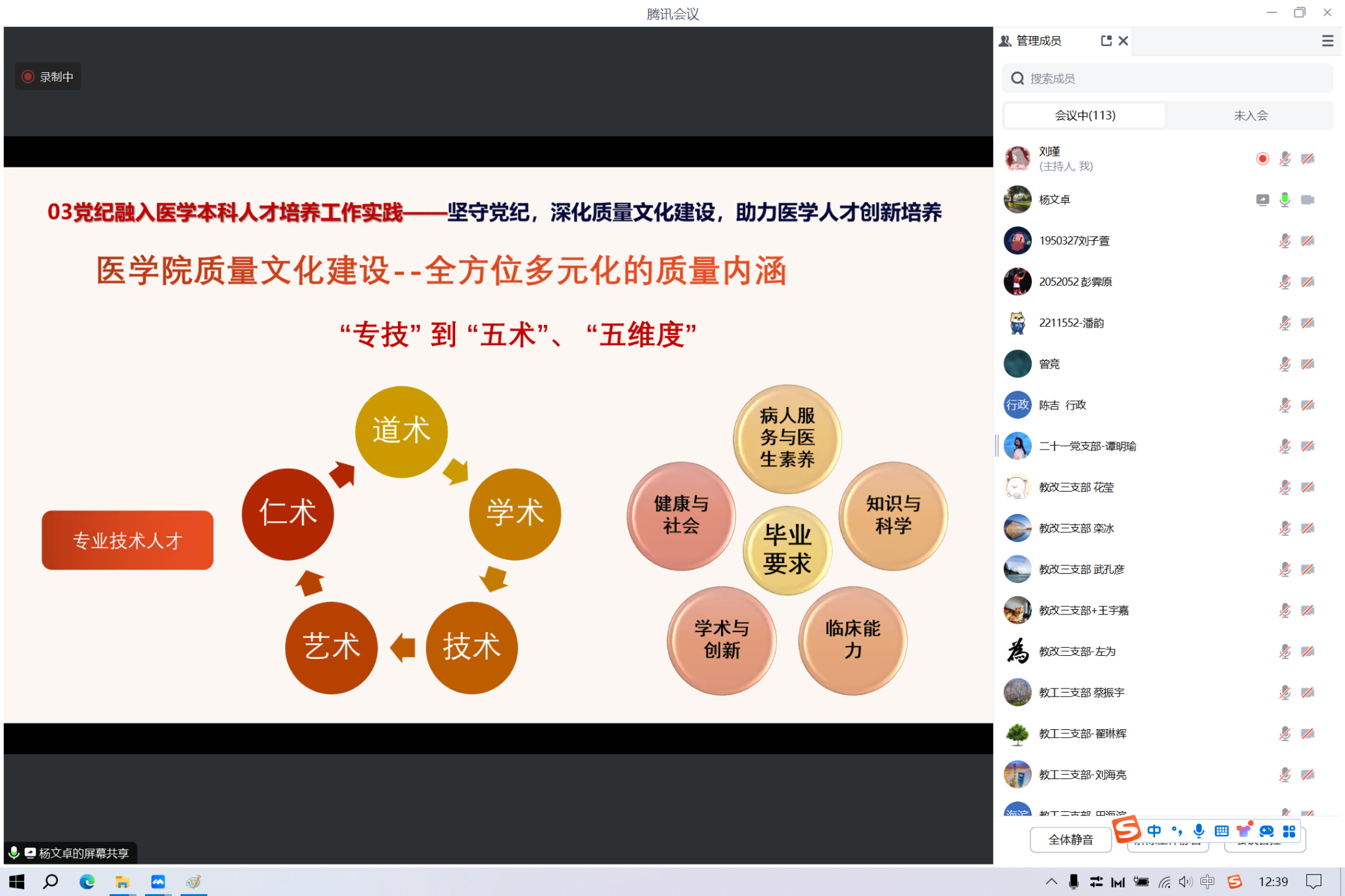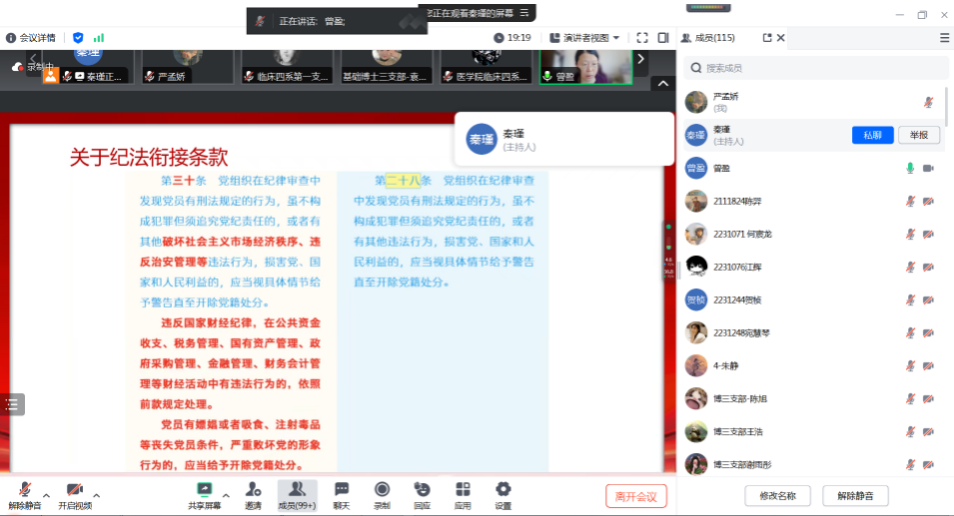 副经理杨文卓的党课主题为《强化纪律意识推进高质量医学本科人才培养》。杨文卓从《中国共产党纪律处分条例》学习的重要性、《中国共产党纪律处分条例》相关重点内容学习、《中国共产党纪律处分条例》融入医学本科人才培养工作实践三个方面进行分享。计有110余名师生党员参与本次党课学习。