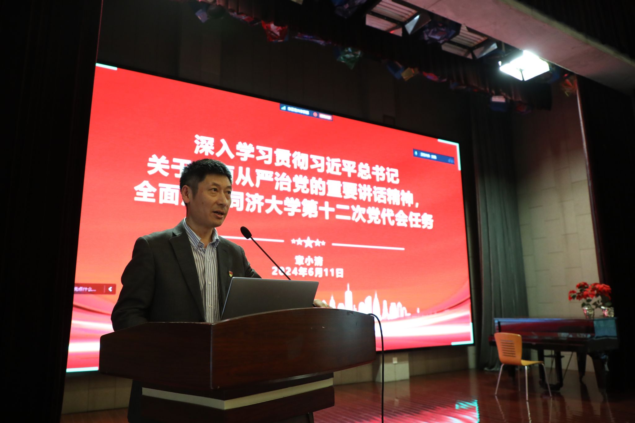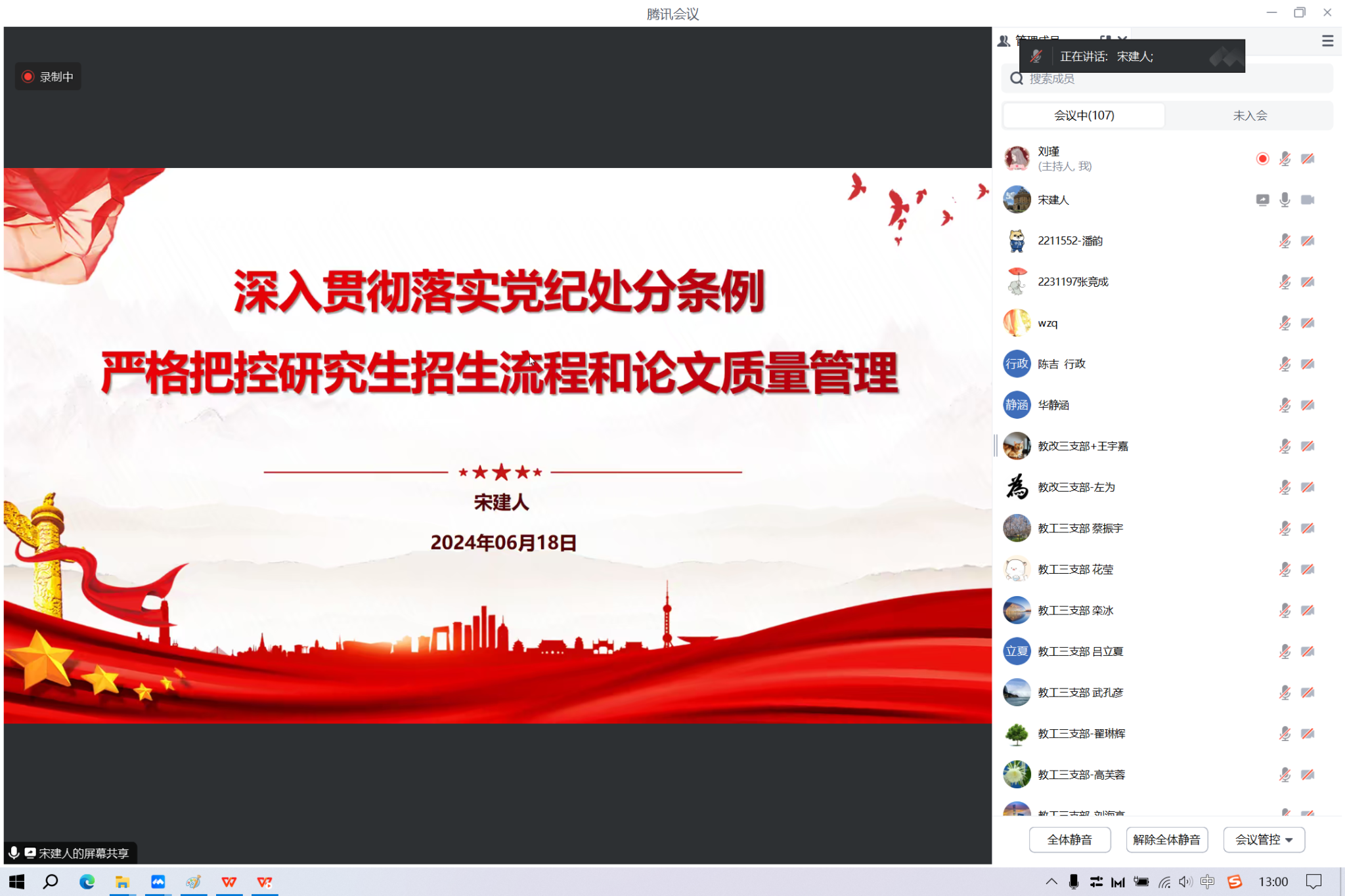 副经理宋建人的党课主题为《深入贯彻落实党纪处分条例,严格把控研究生招生流程和论文质量管理》。宋建人从学条例,守党纪,始终坚持严的基调,全面加强纪律建设、研究生招生流程和论文质量管理两个方面进行分享计有130余名师生党员参与本次党课学习。